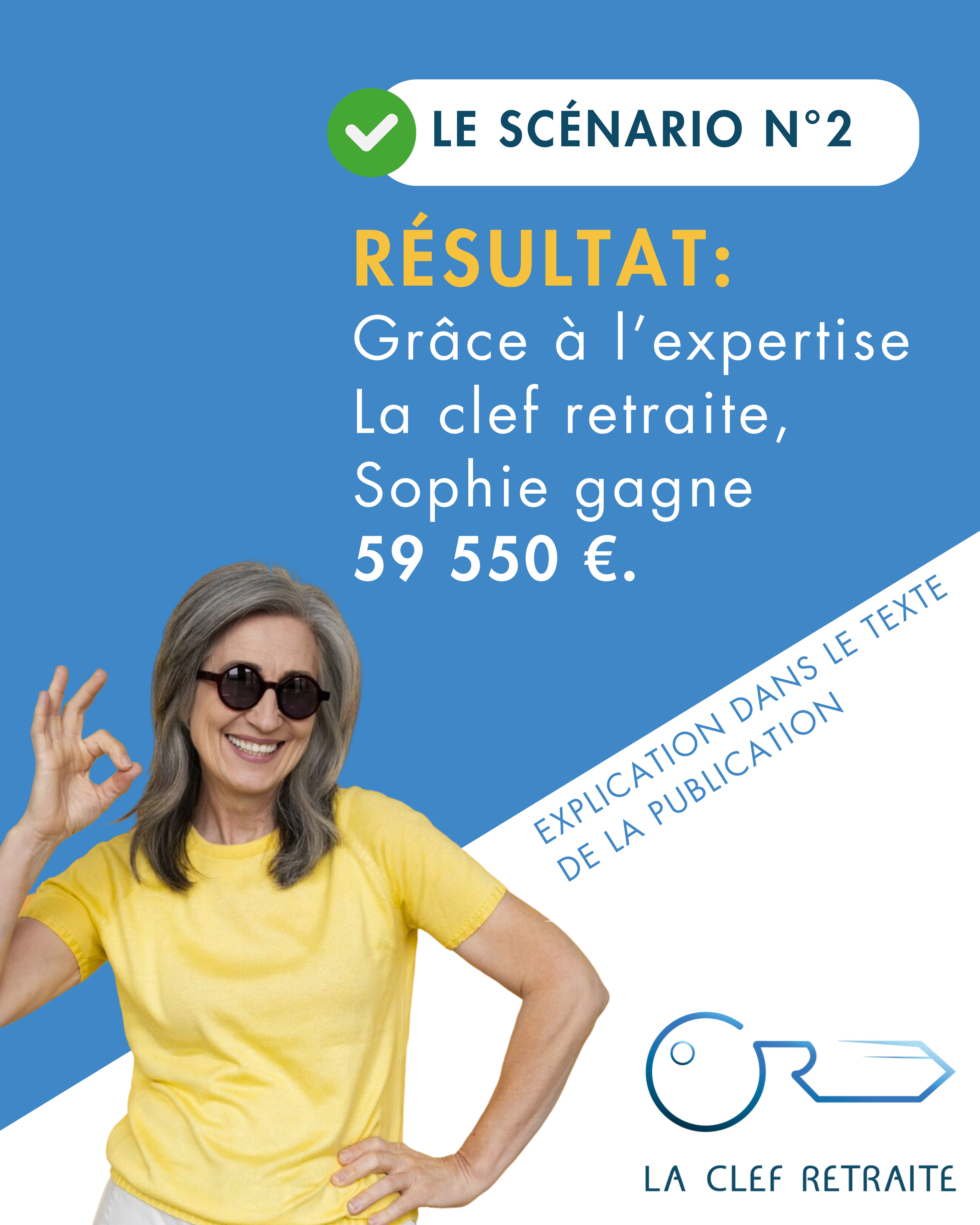 Oui, car par rapport au scénario 1, elle encaisse 30 mois de pension à 2 885 € en plus ! Soit au total : 30 mois x 2 885 € de rente - 27 000 € pour racheter des trimestres = 59 550 € gagnés.